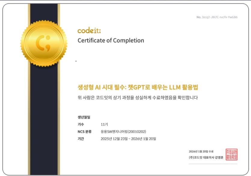LLM수료증 페이지 정보 작성자 최고관리자 댓글 0건 조회 42회 작성일 26-01-01 22:25 목록 답변 글쓰기 본문 LLM수료증 다음글더자람카드 속초 사용처 25.12.31 댓글 0 댓글목록 등록된 댓글이 없습니다.